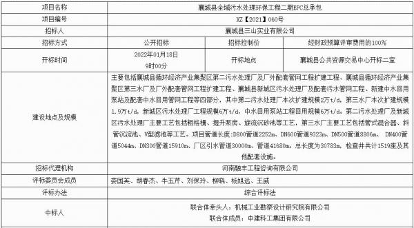 2月10日,河南省襄城縣全域污水處理環(huán)保工程二期EPC總承包(不見面開標(biāo))-結(jié)果公告-****標(biāo)段發(fā)布,中標(biāo)人為機(jī)械工業(yè)勘察設(shè)計(jì)研究院有限公司、中建科工集團(tuán)有限公司聯(lián)合體,工期為24個(gè)月。